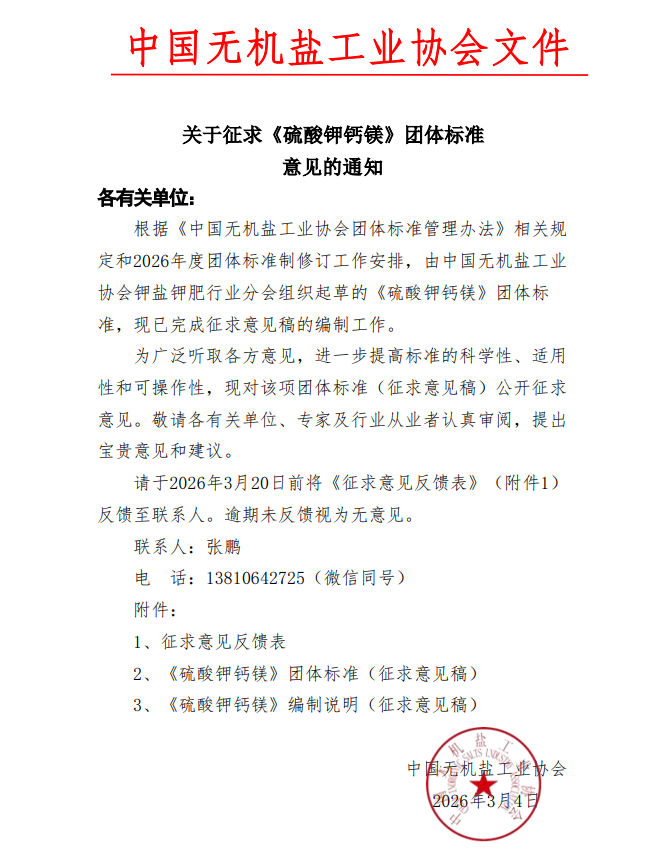 關(guān)于征求《硫酸鉀鈣鎂》團(tuán)體標(biāo)準(zhǔn) 意見的通知