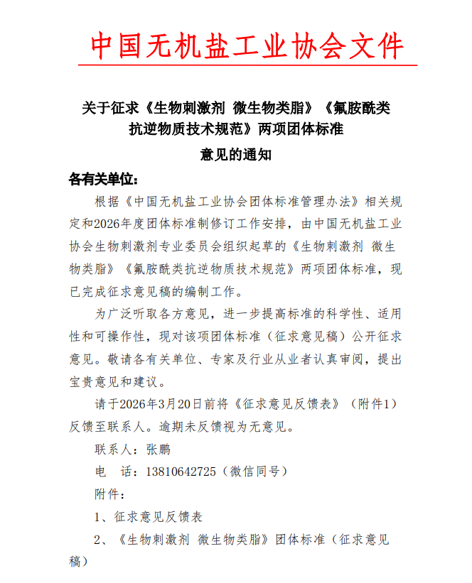 關(guān)于征求《生物刺激劑 微生物類脂》《氟胺酰類抗逆物質(zhì)技術(shù)規(guī)范》兩項團(tuán)體標(biāo)準(zhǔn) 意見的通知